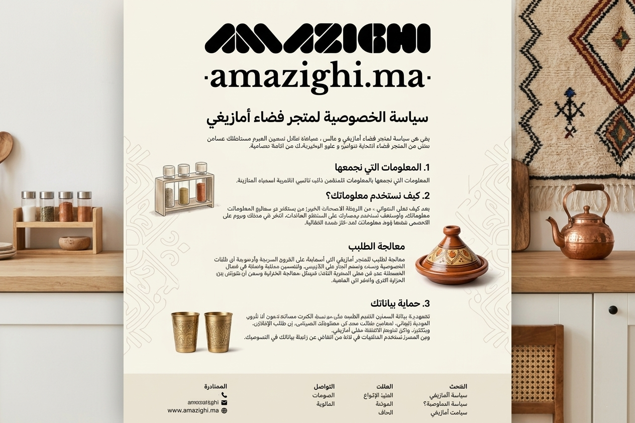 أهلاً بك في متجر أمازيغي. نحن نقدر ثقتك بنا لتجهيز مطبخك بأفضل الأدوات، ولأن خصوصيتك تهمنا بقدر ما تهمنا جودة منتجاتنا، نلتزم بحماية بياناتك الشخصية وتوضيح كيفية التعامل معها بكل شفافية.